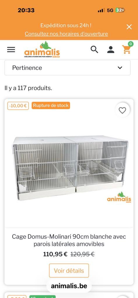 8 avr. 26wegnezMarchin - 24 Cages oiseauxLot de 24 cages domus 55x27x35. 12 Chromées et 12 laqué blanc 2 portes en façades 1 porte de chaque côté séparation et grille de fond grillagée tiroir et clapet pvc propreComme neuf Enlèvement