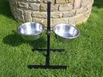 2 écuelles en inox ; diamètre 24,5 cm, hauteur 8 cm. Avec pied support réglable, hauteur maximum 62 cm. Pied démontable (pour voyager par ex) a venir chercher à oupeye( 10 km de liège)
