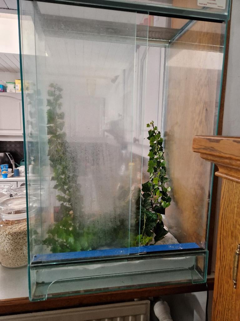 26 mars 26Bart RaamsdonksveerGeertruidenberg, NL - Glazen terrarium / insectenbak te koop.In het bovenpaneeltje zat een barst, daarom hebben we dit zwart getapet zodat het mooi in de bak blendt. Verder is de bak in goede gebruikte staat. Op de bodem zit een klein geel vlekje, maar dat zie