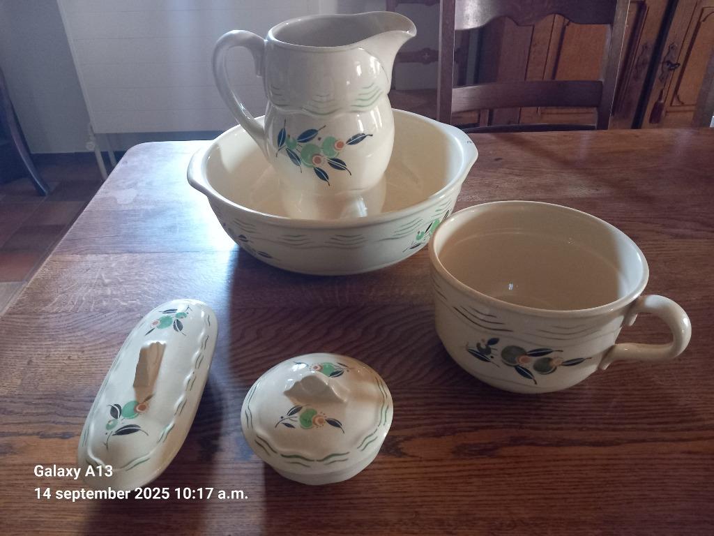 - ENSEMBLE DE LAVABO ANCIEN | BOCH FREERESEnsemble de lavabo art déco ancien. Boch frères belgique countries 1 5 pièces. Parfait état, seul un petit morceau de peinture a été retiré sur la 3ème photo.Enlèvement