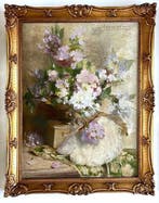 18 mars 26David SzostokHamont - Clothildis Van Der Ouderaa - (1973 - 1910) - RomantischRomantisch stilleven met bloemen en waaier, een olieverfschilderij uit de 19e eeuw van clothildis van der ouderaa, belgië, met een rijk boeket en struisvogelveren waaier op de voorgrond, handgesigneer