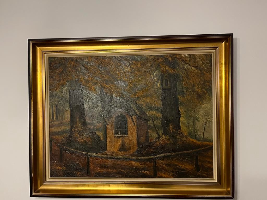 - La chapelle St. Corneille en automneAuthentiek midden 20 ste eeuw vakmanschap. Rustige spiritualiteit, natuur in herfstkleuren en ambachtelijke olieverftechniek. Getekend: daniel, artiste peintre bruxelles 3 kader in bladgoud. AfmetingeEnlèvement