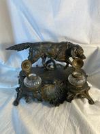 11 mars 26nebnebMons - LE GAGE - Inktpot - Double Encrier Ancien au Chien de ChasseOud dubbel inktvat van régule en glas, gesigneerd le gage, uit 1880–1910, afbeelding van een jachthond setter op een rocaille-fundering, met een kapvormige deksel, afmetingen 17 × 32 × 23 cm, in frank