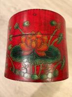 29 mars 26SofieOudenaarde+Deel Ooike - Boîte à chapeau en laque rouge chinoise ancienne - Lotus etBoîte à chapeau chinoise rouge laquée en bois d'époque, dynastie qing (1644–1911), intitulée antique chinese red lacquer hat box - hand-painted lotus & peony - stitched construction.