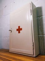 HierPub au topCatawikiToute la Belgique - Armoire à pharmacie - Armoire de premiers secours - Acier,Coffre de secours originaire de pologne, industriel en acier blanc et rouge avec étagères en verre, daté 1960–1970, à verrouillage possible, dimensions 60 cm de hauteur, 40 cm de largeur et 12,5 cm de