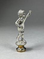 Verzilverde bronzen lakzegel/stempel van een staande jongen die op een luit speelt, gesigneerd aug. Moreau, uit 1850–1900, franse oorsprong, bronzen voet met cloisonné-decoratie, 163 g, afmetingen 9,8 × 4,7 × 3,7 cm, in goede staat met kleine ouderdo...