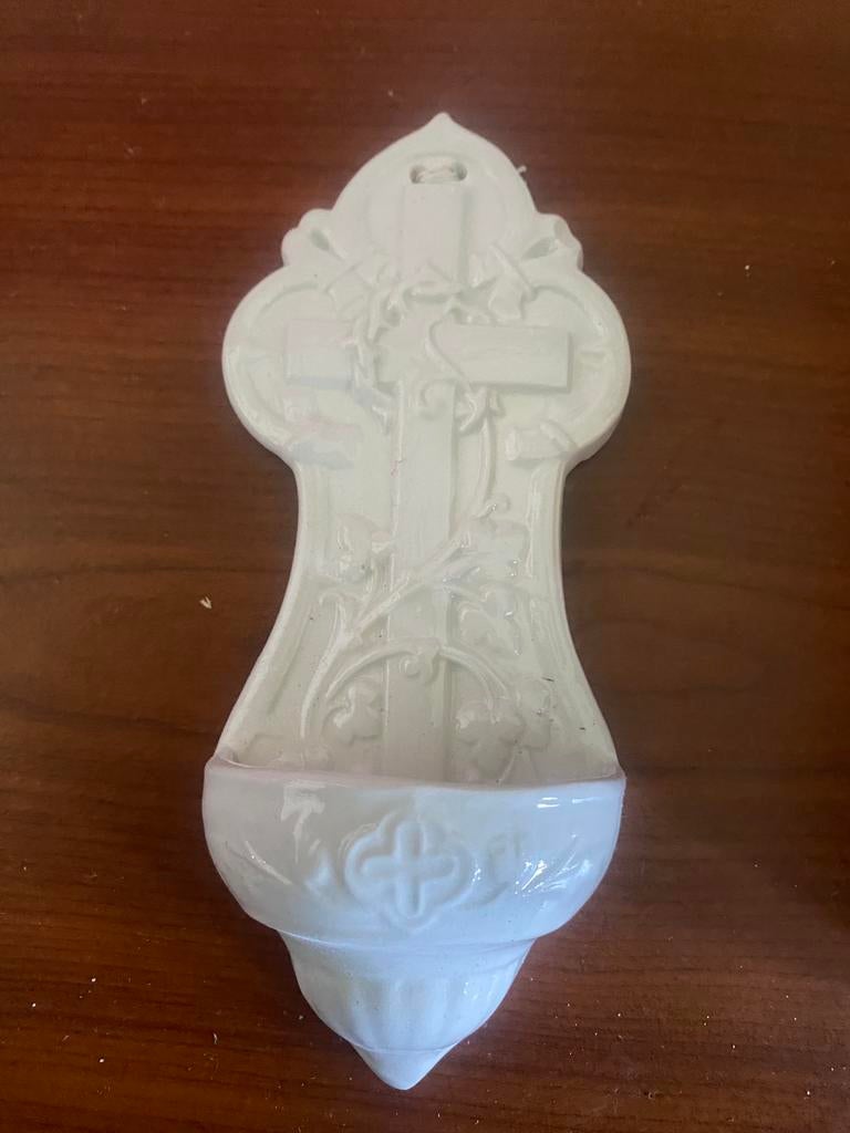 16 sept. 21jourdechineJemappes - petit benitier en porcelaine crucifix et ange (13x6)Benitier en faience avec motif de crucifix et ange en relief origine inconnue dimension 13x6 cm tres bon état frais d'envoi en fonction du choix ref mamy 453Enlèvement ou Envoi