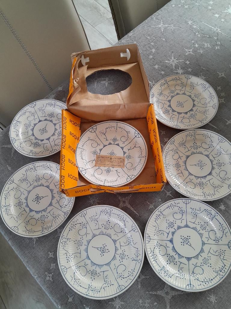 1 oct. 25jourdechineJemappes - 6 assiettes à dessert Copenhagen de BochEnsemble de 6 assiettes à dessert avec motif copenhague assiettes au beau décor blanc éclatant en provenance des ateliers boch de la louvière avec un grand cachet bleu d'authenticité des assiettesEnlèvement ou Envoi