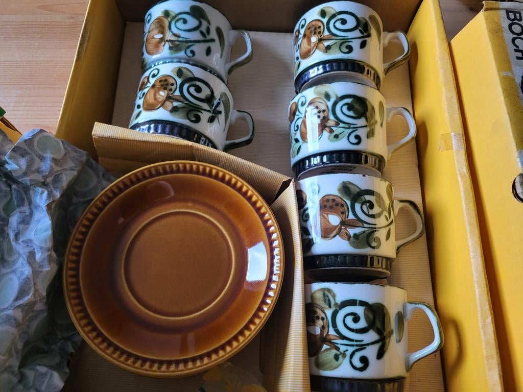 1 avr. 26DebbieDestelbergen - Coffret Bosh Belgique Rambouillet 1841-1966Coffret bosh belgique rambouillet 1841-1966 4 grandes assiettes brunes (1 avec un petit coin vers l'extérieur) 4 assiettes creuses à motifs (1 légèrement craquelée) 4 sacs à motifs 3 soucoupes (ilEnlèvement ou Envoi