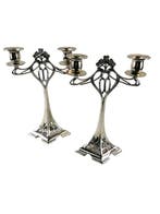 6 avr. 26HansGlabbeek-Zuurbemde - Chandelier (2) - BronzeUne paire de kandeliers de table en bronze argenté décor art nouveau (jugendstil), période estimée 2010–2020, hauteur 28 cm, largeur 18 cm, profondeur 10 cm.