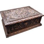Avant-hierCatawikiToute la Belgique - Caisse - Néorenaissance, espagnol ancien - BoisBoîte en bois de bonne taille, datant du xxe siècle, façonnée à la main dans un style néorenaissance avec influences espagnoles anciennes, couvercle orné d’un motif floral central entouré de volutes e