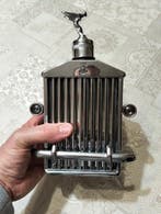 3 avr. 26ThéanoAnderlecht - Décanteur - Métal - Carillon Rolls-RoyceDecanteur en métal pour whisky en forme de grille rolls-royce, daté 1960–1970, avec bouchon portant l’emblème rolls-royce et un carillon activé en soulevant la base; 25 cm de hauteur, 15 cm de largeur