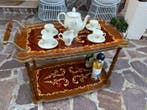 19 mars 25Reversa meubelsBornem - Chariot de service - Bois - Chariot-bar vintageChariot-bar vintage en bois, fabriqué en italie, datant des années 1950–1960, avec incrustations florales sur les plateaux circulaires et une rambarde en laiton doré, étagère inférieure pour bouteille