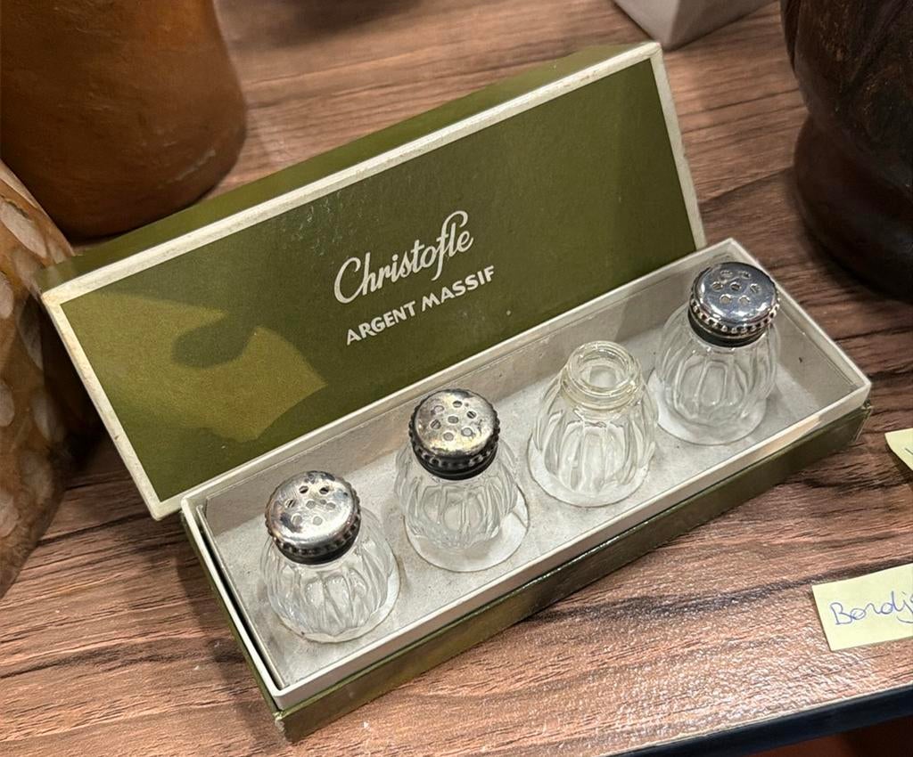 10 avr. 26ImagineHuldenberg - Zoutvat (4) - sterlingsilver - Cardeilhac/ChristofleVier zout- en peperstrooiers van sterling zilver en kristal, vervaardigd in frankrijk, daterend uit 1930–1940, elk circa 4 cm hoog bij 3 cm breed en 2 cm diep, met een brutogewicht van 500 g, in de or