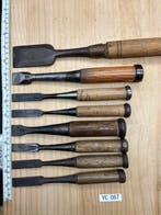 - Ensemble de ciseaux à bois japonais YC88 – 9 pièces,Ensemble de neuf gouges de menuisier japonais (yc88) avec lames en acier au carbone et poignées en bois, incluant une gouge ronde, en bon état d’usage avec signes d aged et imperfections, origine japo