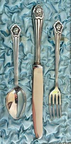 - Ménagère (2) - Argent 835 - Ensemble pour enfantDeux pièces en argent massif 835, ensemble de couverts pour enfant avec couteau, fourche et cuillère du portugal, style art nouveau, période 1930–1940, poids 55 g, dans sa boîte d'origine.