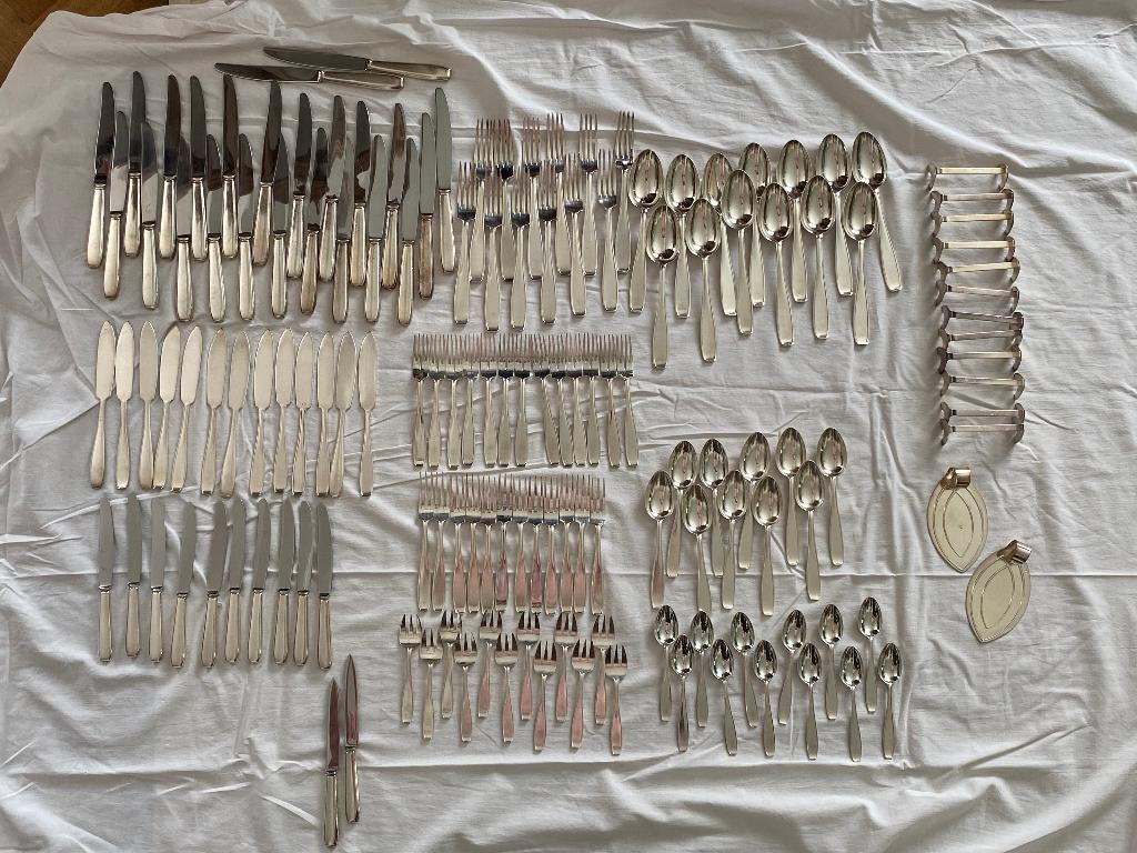 3 sept. 23Bonnie LachineuseUccle - Coutellerie Bruno WiskemannCollection complète de couverts de la célèbre marque bruno wiskemann pour 12 personnes avec quelques articles de service. Il est fortement argenté, bien entretenu, peu utilisé et de grande qualité. LeEnlèvement