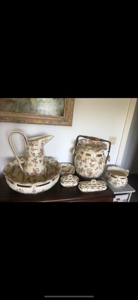 21 janv. 25De VosAmougies - Ancienne garniture de toilette.Description ensemble de toilette ancien (ensemble de salle de bain du passé qui était utilisé à l’époque pour l’hygiène personnelle).3 Pièces se composant d'un broc, d'une cuvette, d'un poEnlèvement