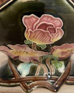 4 sept. 25Pub au topCatawikiToute la Belgique - FIVES à Lille - Gustave DE BRUYN (1838-1916) - Jardinière -Jardinière art nouveau en faïence, fives à lille, gustave de bruyn (1838-1916), période 1910-1920, 25 cm de haut sur 20 cm de large, décor émaillé de fleurs roses et arabesques brunes sur fond vert, e