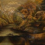 - Northern European school (XIX-XX) - River landscape withPeinture à l'huile sur toile intitulée « river landscape with rocks and farmhouse » de l’école nord-européenne (xix-xx), datant du xixe siècle dans le style réaliste, encadrement en bois sculpté e
