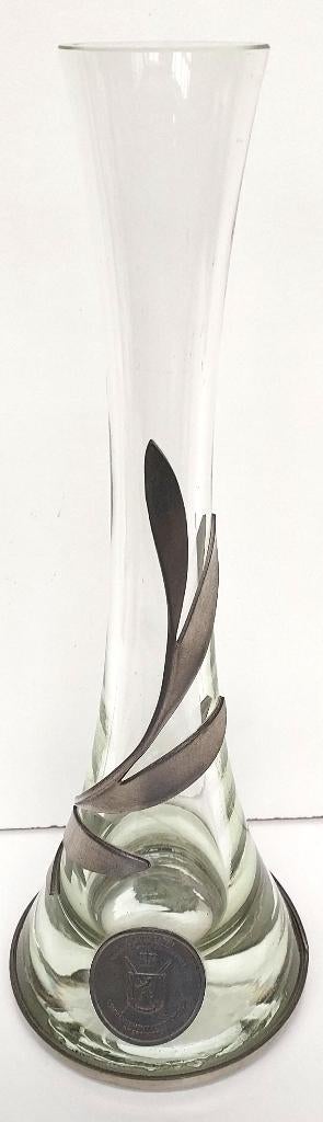 Avant-hierJasperHerent - brocanteVase en verre à décor en étain avec médaillon faisant référence au commandement territorial commandevent décoration territoriale hutois belgique 94% étain pur en très bon état 29 cmh ø au-dessus de 4Enlèvement ou Envoi