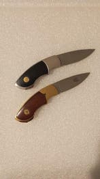 HierPub au topCatawikiToute la Belgique - Franklin Mint - Canif (2)Deux couteaux de collection sur le thème des labradors de franklin mint avec lame en acier inoxydable, gravure en relief plaquée or d’un oiseau et d’un couple de chiens sur le manche, dos en bois acaj