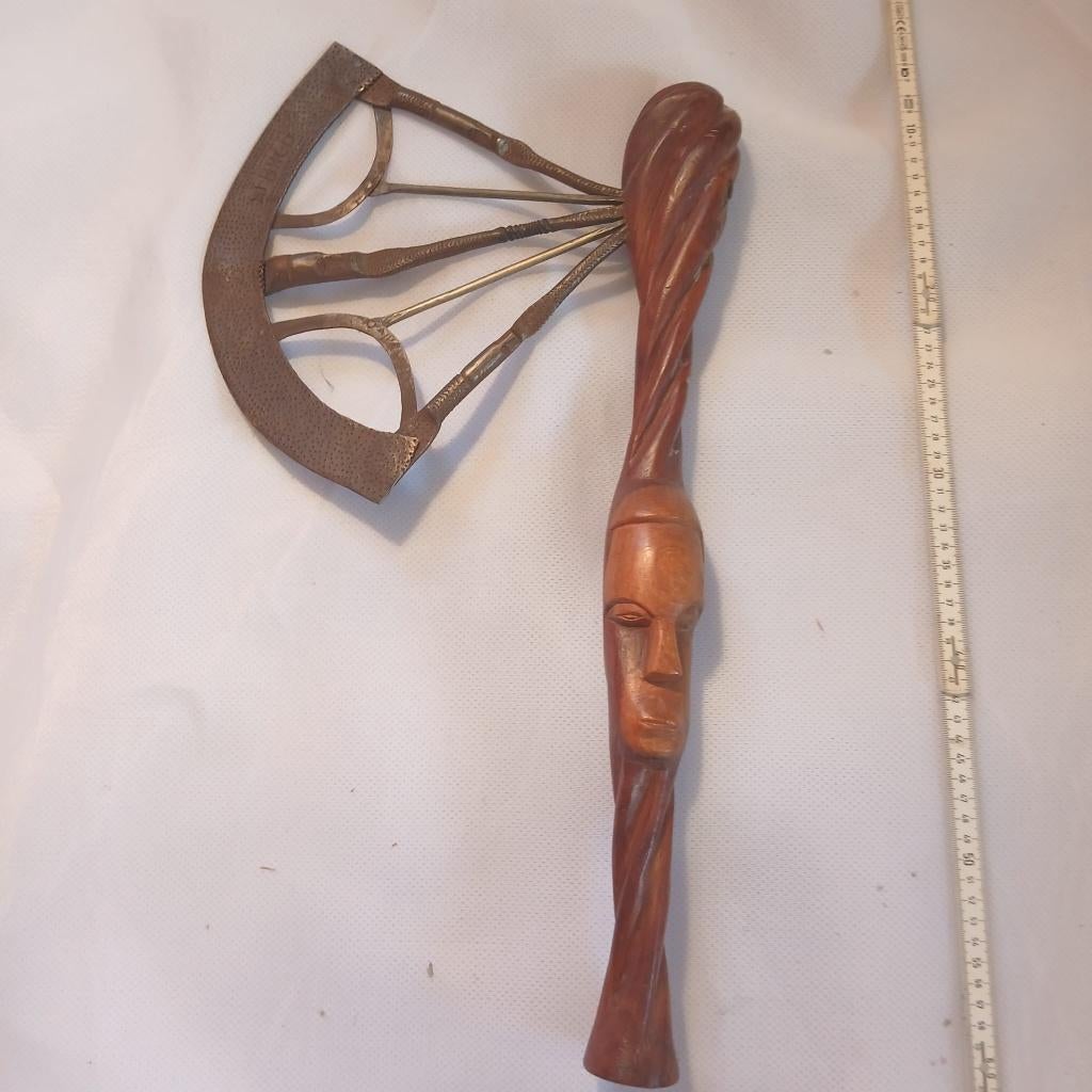 12 mars 26codeRetinne - Hache africaine à capuchon / hache de chasse CongoCongo 1930s-1940s hache authentique utilisée pour l'exploitation forestière et parfois aussi pour la chasse bel état de conservation longueur 43 cm largeur 22 cmEnlèvement ou Envoi