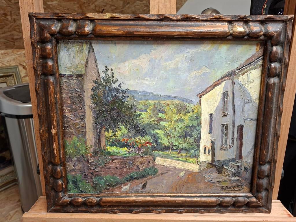 7 août 25⊙⊙Bruxelles - §hsp rue de l'eglise signé emile descampHsp representant la rue de l'église village inconnu signé par emile descamp dimension 52x45cm placée dans encadrement doré 65x56cm bon état d burEnlèvement ou Envoi