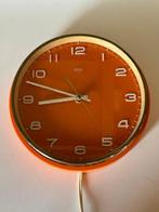 Metamec wandklok, vintage uit de jaren 1960, van britse herkomst, elektrisch 220 v synchroon mechanisme, één-dagen krachtreserve, gebogen glazen voorzijde, kunststof wijzerplaat, chromen metalen rand, oranje space age ontwerp met driedimensionale cij...