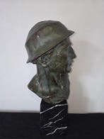 21 janv. 26Familie RonsseOudenaarde+Deel Ooike - Tête de personnage - Buste dhomme au casque - Marbre,Buste en plâtre patiné de style réalisme, représentant un mineur, daté 1940–1950, patine vert-bronze, dimensions 44,5 × 22 × 22 cm, poids environ 8 kg, signé et numéroté 2262, origine belge, état exce