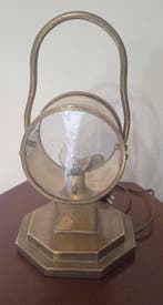 Aujourd'huiCatawikiToute la Belgique - Lampe de marine - LaitonLampe nautique en laiton d’origine italienne, datant de la seconde moitié du xxe siècle, pesant 2,2 kg, base octogonale de 17 cm, hauteur 23 cm (30 cm avec la poignée), circonférence de la lampe 13 cm
