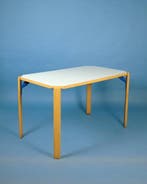 24 déc. 25timGeraardsbergen - Kusch & Co. - Bruno Rey - Table à manger - Bois, linoléumTable à manger conçu par bruno rey pour kusch & co., Fabriqué en allemagne dans les années 1970, avec un plateau blanc stratifié, des pieds en bois massif et des coins bleus moulés, dimensions 120