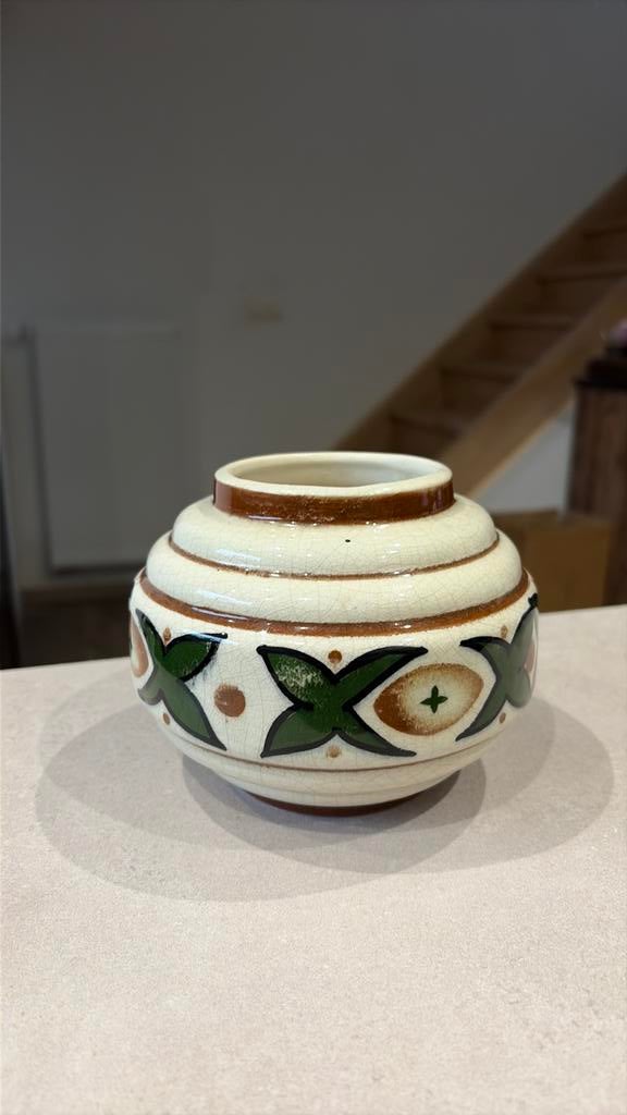 5 avr. 26GuernicaMerchtem - Vase art deco mouzinIl s'agit d'un vase en céramique vintage, potentiellement d ´auguste mouzin & cie, de couleur beige avec des motifs floraux/géométriques verts et bruns. Matériau : céramique ou grès émaillEnlèvement ou Envoi