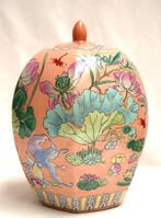 Aujourd'huiPub au topCatawikiToute la Belgique - Vase avec couvercle - Porcelaine - 37 cm peint à la mainUne vase à bouteille en porcelaine chinoise, peinte à la main avec un glaçage apricot, représentant des lotus, des papillons, des cigales, des poissons et des mandariniers, hauteur 37 cm, largeur 29 c