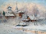 Monastère sous la neige - village au bord de la rivière est une peinture à l’huile originale de mikhail kraiev (1957), 30 × 40 cm, signée à la main, france, période 2020 et après, année 2022, avec certificat d’authenticité signé par l’artiste remis à...
