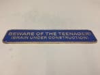 - Plaquette - Plaque en fonte avec inscriptionUne reproduction de 2024 d’une plaque en fonte, 37 cm de large, 8 cm de haut et 8 cm de profond, pesant 1,1 kg, bleu cobalt avec bord doré, portant l’inscription “beware of the teenager (brain under c