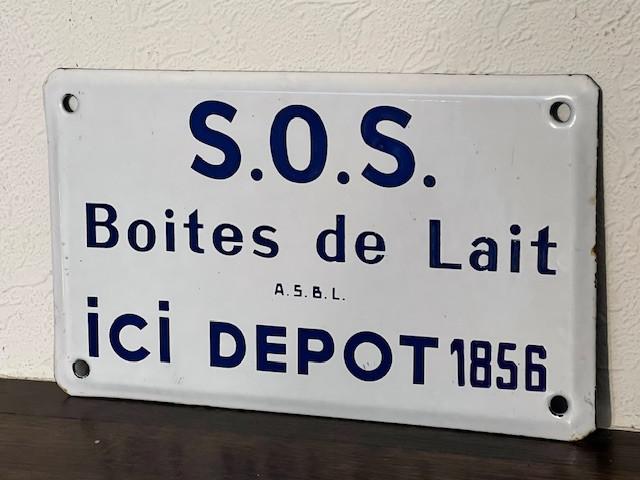 - Ancienne plaque émaillée S.O.S. boîtes de lait, A.S.B.L.Ancienne plaque émaillée, « s.o.s. Boîtes de lait, a.s.b.l. Ici dépôt 1856 ». La plaque émaillée est en parfait état. 15 X 25 cm.Enlèvement