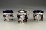 - Conteneur à épices - Argent 800Paire de récipients en argent pour condiments (salier et pot à moutarde) avec inserts en verre cobalt, fabriqués en belgique (liège) au cours de la première moitié du xixe siècle, argent 800, poids to