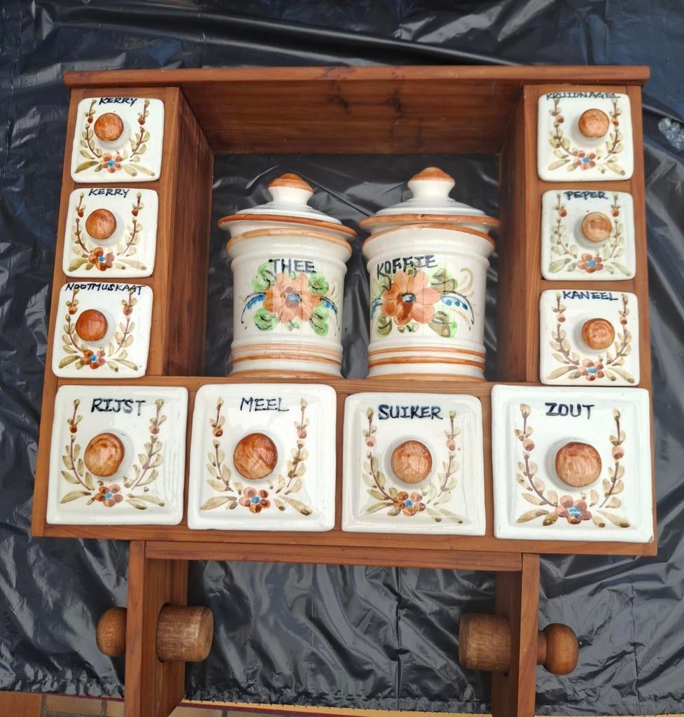 Avant-hierMismuOudenaarde+Deel OoikeÉtagère à épicesEnlèvementétagère à épices complète. Pots en bois et en pierre. Avec porte-essuie-toutOudenaarde+Deel OoikeAvant-hier - lot de 11 pots à épices en faïenceUn magnifique lot de 11 pots à épices (lot complet) trois tailles différentes constituent l'ensemble aucun défaut, aucune cassure ni ébréchure tous les couvercles présents ce qui est rare vu le noEnlèvement ou Envoi