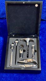 - Pierre Cardin - Accessoire pour le vin - Plaque dargent,Vintage pierre cardin paris ensemble d’outils à vin et bar plaqué argent, circa années 1970, dans une boîte présentoir en bois, comprenant tire-bouchon, ouvre-bouteille/coupefoil, pouroir, bouchons et
