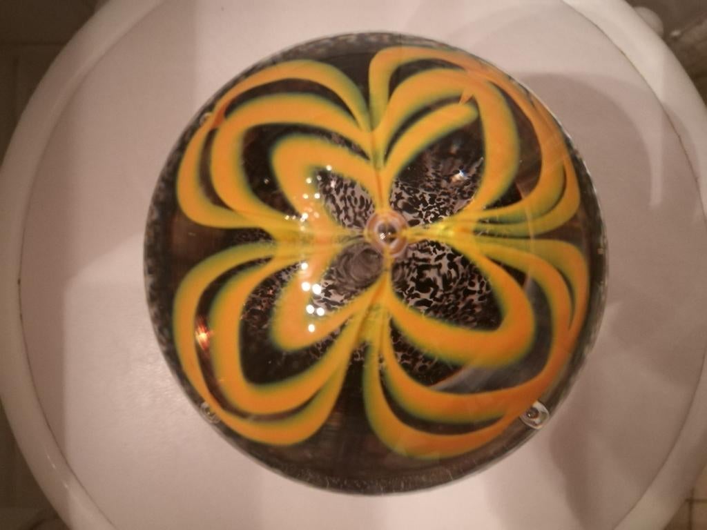 4 nov. 25JeanLinkebeek - sulfure 040326-5Très joli sulfure presse papier en verre décor fond jaune et decor blanc diamètre 7 cm très bon état frais d'envoi en fonction du choix ref c fruit noir casiEnlèvement ou Envoi
