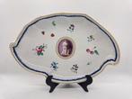 Assiette ovale en porcelaine polychrome de ginori à doccia, italie, circa 1790–1810, medaillon camaïeu puce représentant une figure féminine classique drapée, bord bleu cobalt à bordure dentée dorée, motifs floraux et fruitiers sur le fond, verso non...