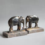 19 mars 26xaviermagWezembeek-Oppem - Serre-livres (2) - Éléphants - Régule, MarbrePaire de serre-livres en régule à patine bronze représentant des éléphants stylisés, sur bases rectangulaires en marbre, style art déco, période 1930–1940, france; dimensions 13×7,5×11 cm; poids envir