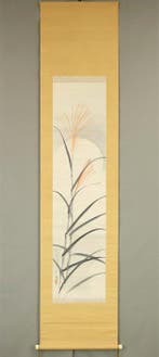 - Autumn Moon and Silver Grass - with signature and sealRoulot japonais peint à la main sur kakemono intitulé autumn moon and silver grass, signé et scellé « unpo » , édition originale, scène nocturne datant de 1940–1950, dimensions 50,6 cm × 201,9 cm, mat