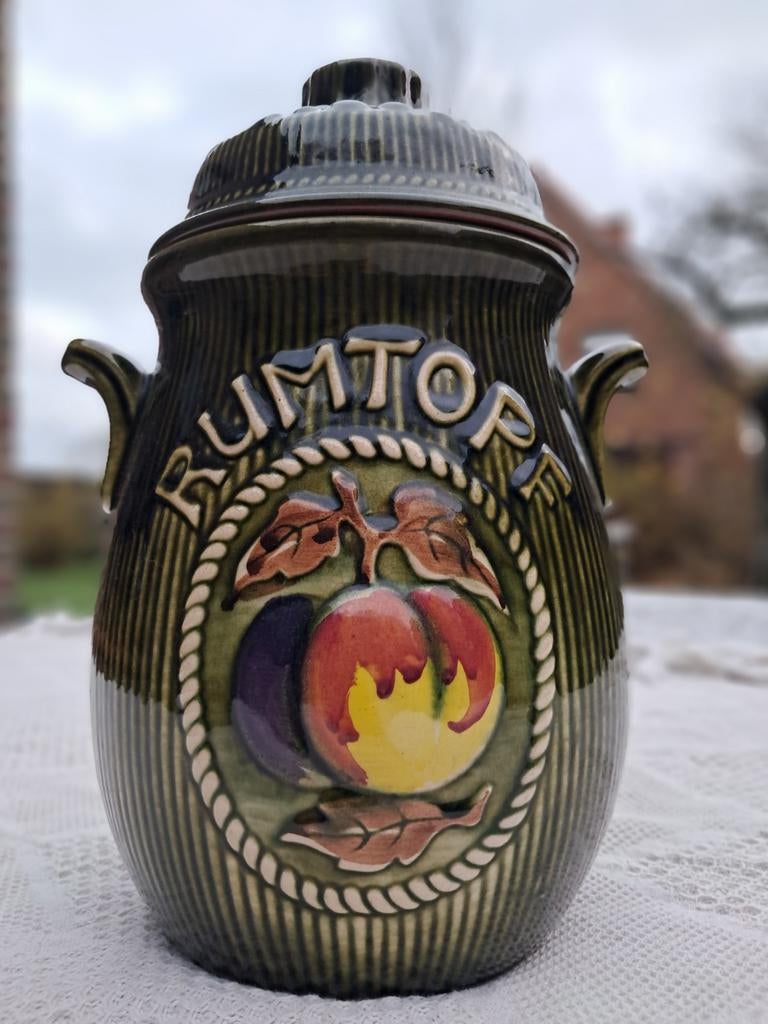 12 mars 24IsabelleLembeek - Rumtopf -West-DuitslandZeldzame vintage uit de jaren 1960 een prachtige grote vintage rumtopf vier liter. De voor- en achterkant van deze pot is versierd met vormen van vruchten en staat het woord rumtopf vermeld. Is voorziEnlèvement ou Envoi