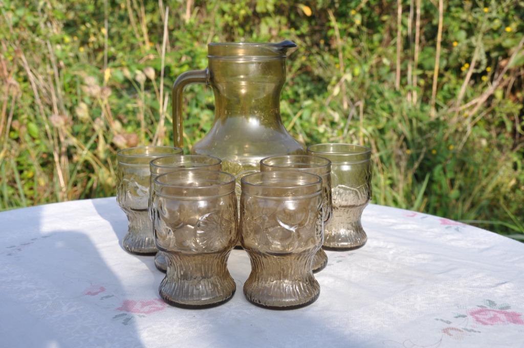 HierlaurensMerelbeke+Deel Zwijnaarde - service a limonade en verre brunService a limonade en verre brun avec decor de fruits en relief composé d'une carafe pichet hauteur 23 diamètre 13 m et de 6 verres de 11x7 cm bon état ref d 350Enlèvement ou Envoi