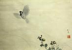 - Kacho-zu (Flowers and sparrow) - With signature and sealHangende litho-s met handtekening en zegel uit japan, getiteld kacho-zu (bloemen en mus), uit de showa-periode (ca. 1960–1970), Met de hand geschilderd op zijde en gemonteerd op papier en zijde, total