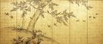 28 févr. 26Pub au topCatawikiToute la Belgique - Vouwscherm met vogels en dennenboom - goudblad, gelakt hout,Een zesdelige bybu uit japan uit de taish-periode met een sumi-e schildering van een kromme den en een levendige zwerm gele vogels op goudblad, omgeven door zijde brokaatbanden en geplaatst in een rod