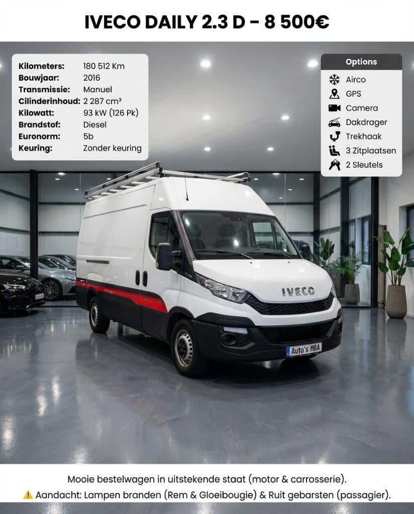 |* iveco daily diesel euro5b *| kilométrage : 180512 km année : 2016 cylindrée : 2287 cm³ transmission : manuelle kilowatt : 93 kw (126 ch) carburant : diesel euronorme : 5b contrôle technique : sans