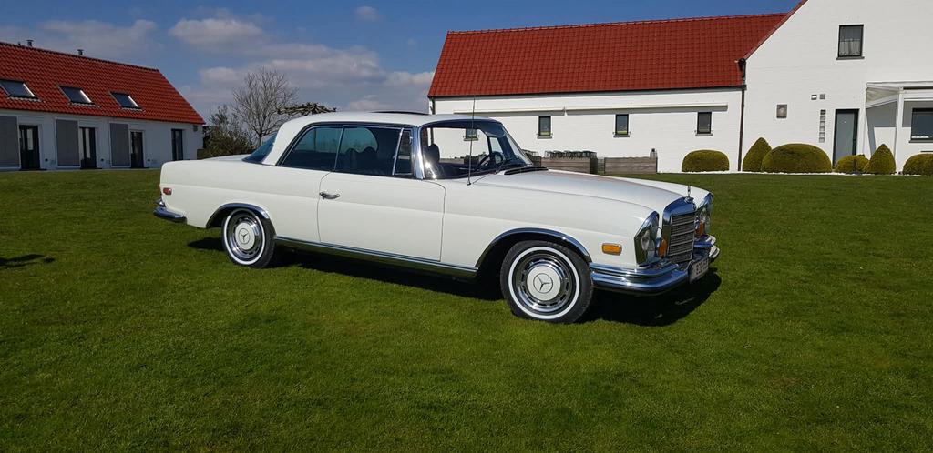 Mercedes 280 se coupe modèle américain. 1970. Climatisation, toit ouvrant, cuire,… beaucoup de facture de restauration avec la voiture. La voiture tourne bien mais il y a un problème de fumée à l écha